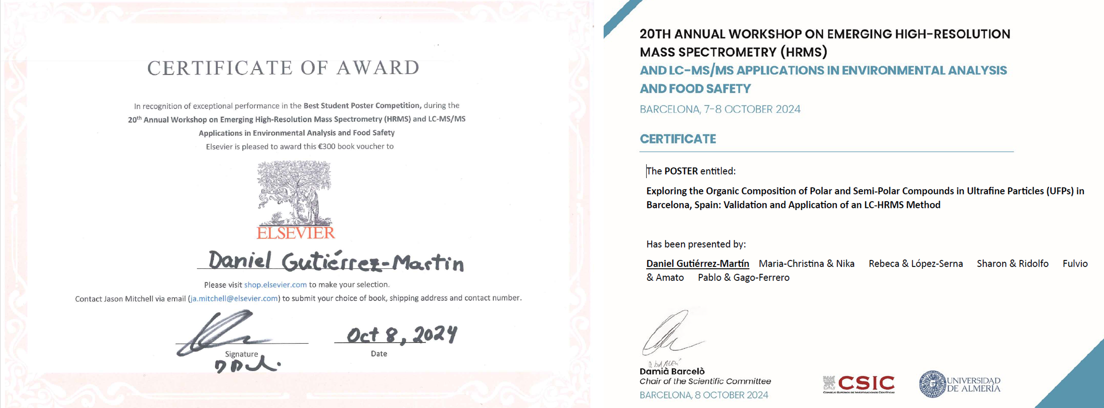 Daniel Gutiérrez-Martín, PhD student, received the Best Poster Presentation Award at the 20th Annual Workshop on Emerging HRMS and LC-MS/MS Applications in Environmental Analysis and Food Safety, for the study entitled "Exploring the Organic Composition of Polar and Semi-Polar Compounds in Ultrafine Particles (UFPs) in Barcelona, Spain: Validation and Application of an LC-HRMS Method".